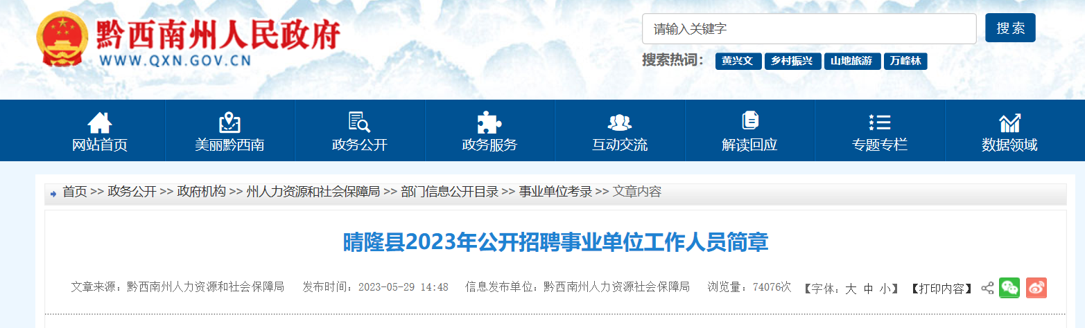 在黔西南州人力資源和社會保障局(http://www.qxn.gov.cn/zwgk/zfjg/zrlzyshbzj/bmxxgkml_5135118/)、晴隆縣人民政府(http://www.gzql.gov.cn/)網(wǎng)站發(fā)布公開招聘公告。