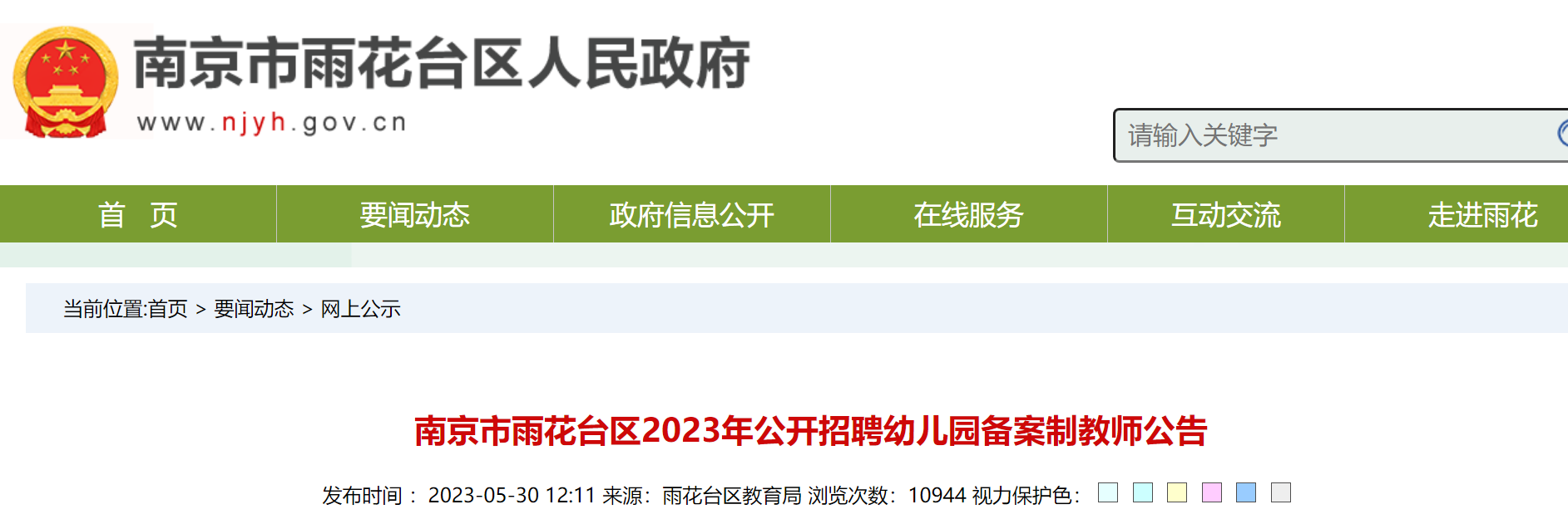 本次招聘相關(guān)信息在南京市雨花臺區(qū)人民政府網(wǎng)(http://www.njyh.gov.cn)、南京市教育局網(wǎng)(http://edu.nanjing.gov.cn/)公開發(fā)布。