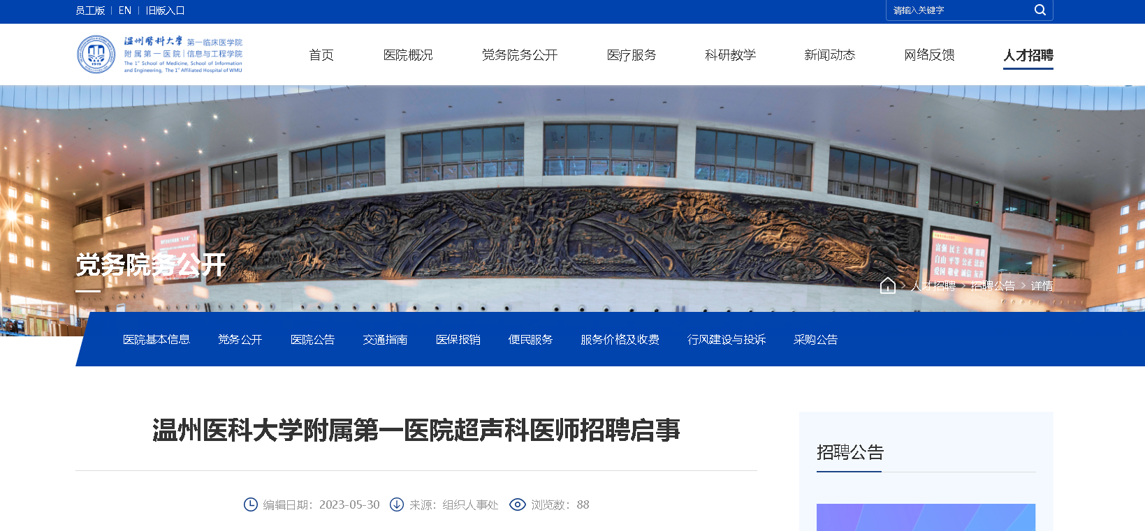 2023年浙江溫州醫(yī)科大學(xué)附屬第一醫(yī)院招聘超聲科醫(yī)師10人,自本通知發(fā)布之日起接受報名,招滿為止,現(xiàn)將招聘公告原文發(fā)布如下:
