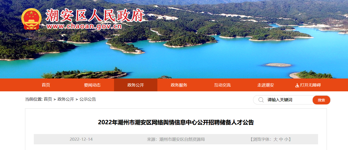 通過(guò)潮州市潮安區(qū)人民政府網(wǎng)站向社會(huì)發(fā)布招聘信息。(http://www.chaoan.gov.cn/)