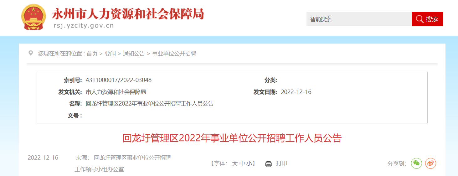 2022年12月16日發(fā)布招聘公告,相關(guān)信息在永州市人力資源和社會(huì)保障局及回龍圩管理區(qū)政府網(wǎng)(http://hlxglq.yzcity.gov.cn/)公布。