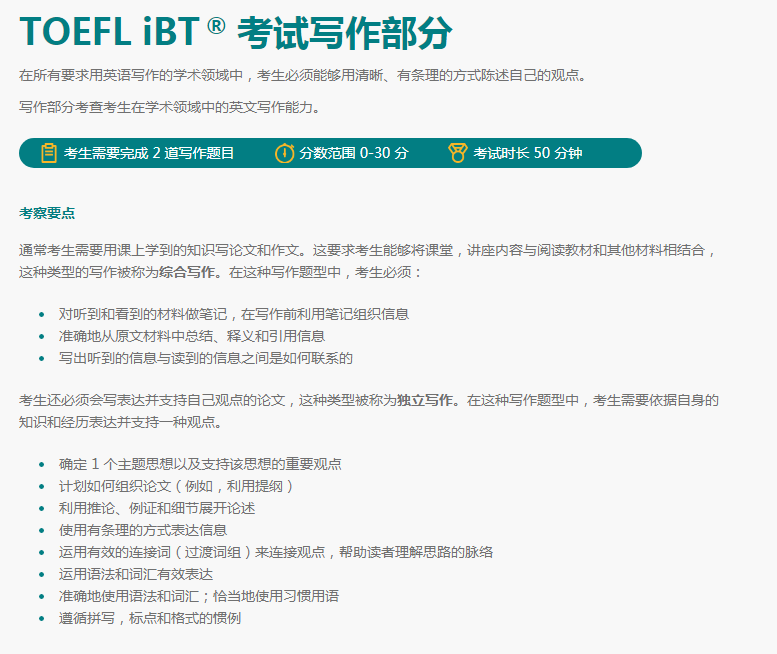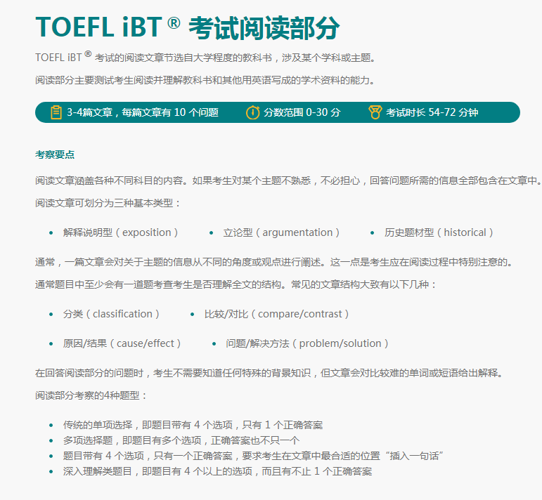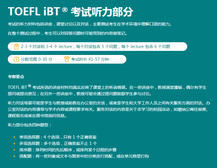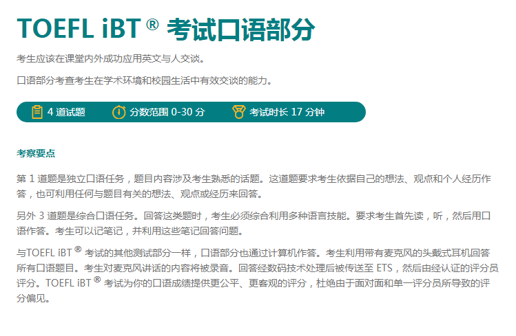 托福網(wǎng)考®(TOEFL iBT®)的順序為閱讀、聽力、口語、寫作,全程約3小時??荚嚫鲉雾棡?0分,總分120分。