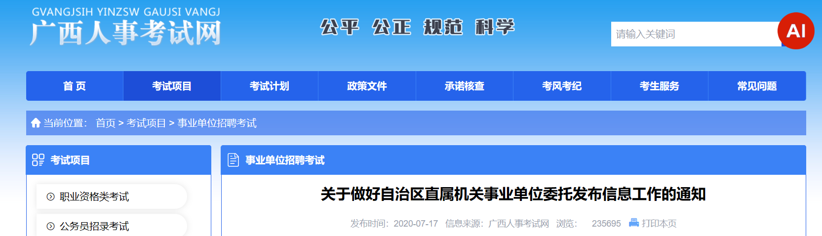 根據(jù)《國務(wù)院關(guān)于發(fā)布〈國家行政機關(guān)公文處理辦法〉的通知》(國發(fā)〔2000〕23號)、《關(guān)于加強黨政機關(guān)網(wǎng)站安全管理的通知》(中網(wǎng)辦發(fā)文〔2014〕1號)、《廣西壯族自治區(qū)公務(wù)員錄用實施辦法(試行)》和《關(guān)于印發(fā)〈廣西壯族自治區(qū)事業(yè)單位公開招聘人員實施辦法〉的通知》等文件精神,為積極配合自治區(qū)本級公務(wù)員考試錄用和事業(yè)單位招聘工作,做好自治區(qū)直屬機關(guān)事業(yè)單位委托我院在廣西人事考試網(wǎng)發(fā)布信息工作,現(xiàn)將具體工作明確如下: