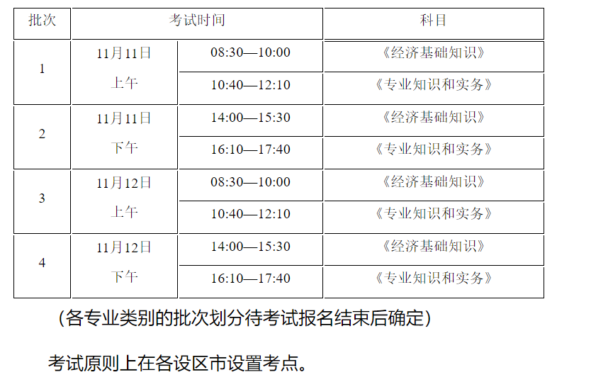 (二)初中級(jí)經(jīng)濟(jì)考試均設(shè)公共科目《經(jīng)濟(jì)基礎(chǔ)知識(shí)》和專業(yè)科目《專業(yè)知識(shí)和實(shí)務(wù)》,題型均為客觀題。初中級(jí)經(jīng)濟(jì)考試分2天上、下午4個(gè)批次實(shí)施。各級(jí)別及專業(yè)類別的具體考試時(shí)間和批次劃分視報(bào)名情況另行確定。