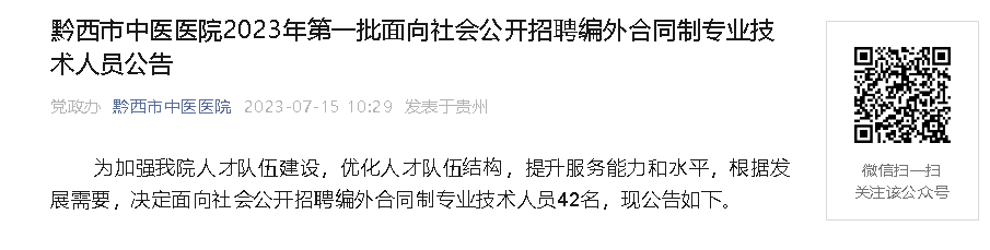 2023貴州畢節(jié)黔西市中醫(yī)醫(yī)院招聘編外合同制專業(yè)技術(shù)人員42人,報(bào)名時(shí)間:2023年7月24日至7月25日(8:30—12:00;14:00——17:30),現(xiàn)將招聘公告原文發(fā)布如下:
