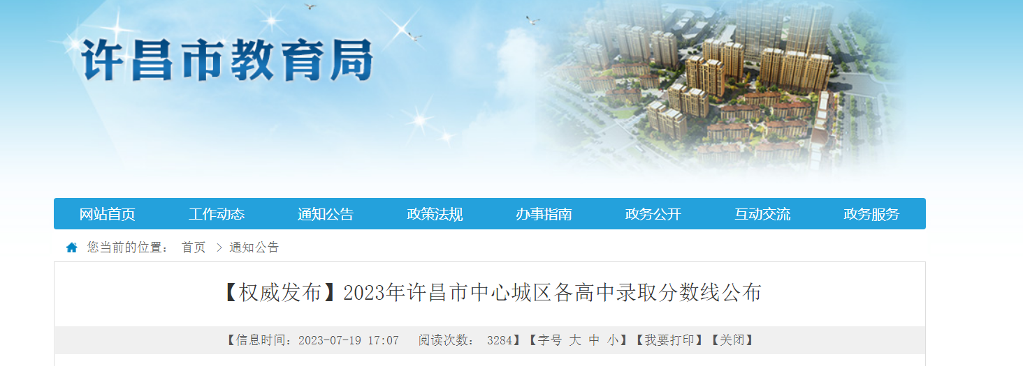 根據(jù)《關(guān)于做好許昌市2023年普通高中招生工作的通知》要求,市教育局通過(guò)河南省普通高中招生考生服務(wù)平臺(tái)系統(tǒng)確定了中心城區(qū)各高中錄取分?jǐn)?shù)線,并報(bào)經(jīng)上級(jí)主管部門(mén)審核同意,現(xiàn)公布如下: