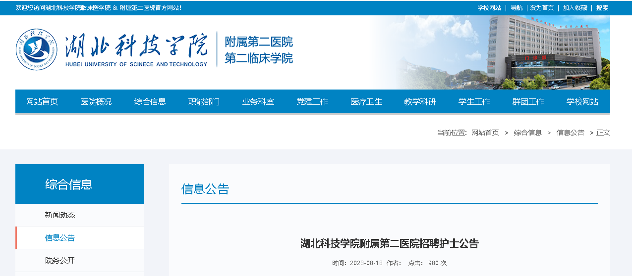 2023湖北科技學(xué)院附屬第二醫(yī)院招聘護(hù)士13人,各專(zhuān)業(yè)崗位報(bào)名截止至2023年9月10日18:00,現(xiàn)將招聘公告原文發(fā)布如下: