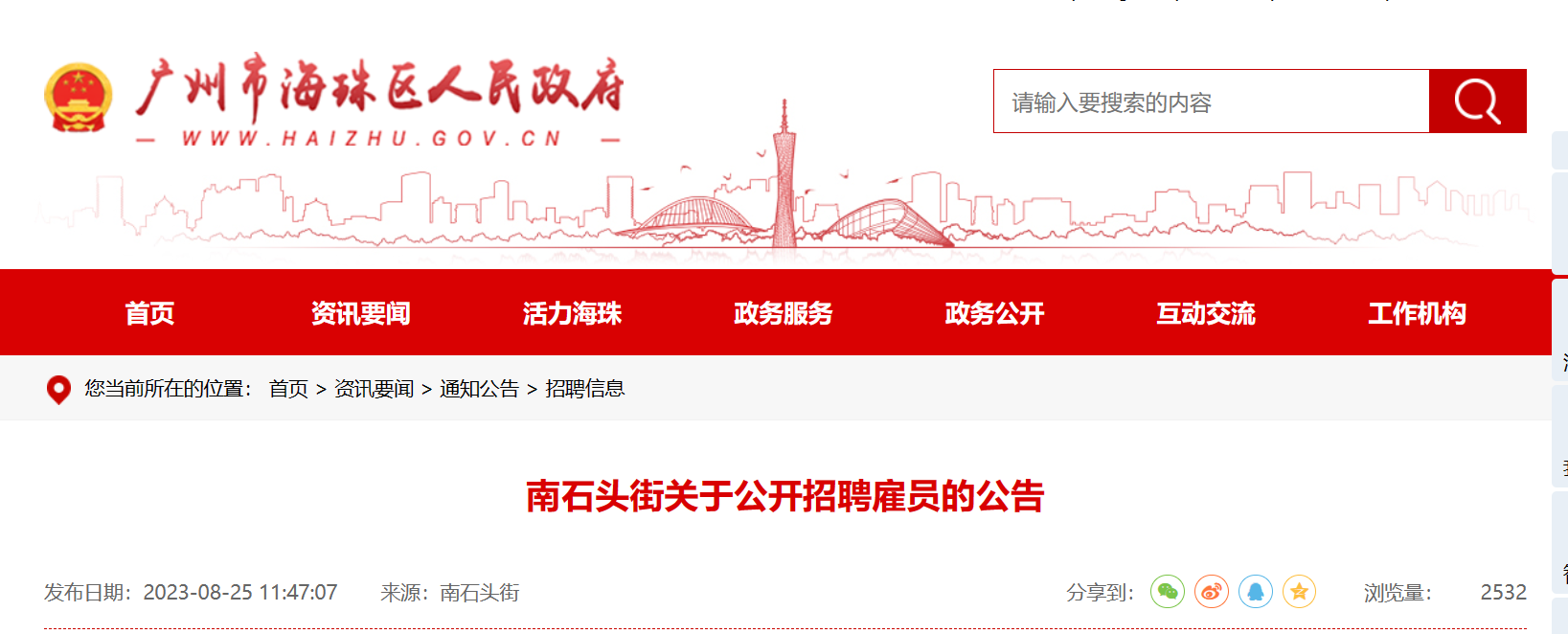 2023年廣東省廣州市海珠區(qū)南石頭街招聘雇員13人。報名時間:2023年8月28日-2023年9月1日?,F(xiàn)將公告原文發(fā)布如下: