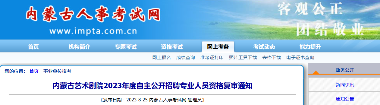 2023年內(nèi)蒙古藝術(shù)劇院自主招聘專業(yè)人員資格復(fù)審?fù)ㄖ?。資格復(fù)審時間:2023年8月31日-9月3日,上午9:00-12:00、下午14:30-17:30(見附件2)?,F(xiàn)將公告原文發(fā)布如下: