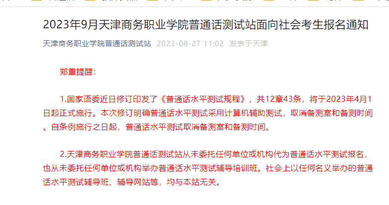為滿足廣大社會考生需求,做好相關工作,根據(jù)《普通話水平測試管理規(guī)定》,天津商務職業(yè)學院普通話測試站現(xiàn)將2023年9月考試工作安排如下: