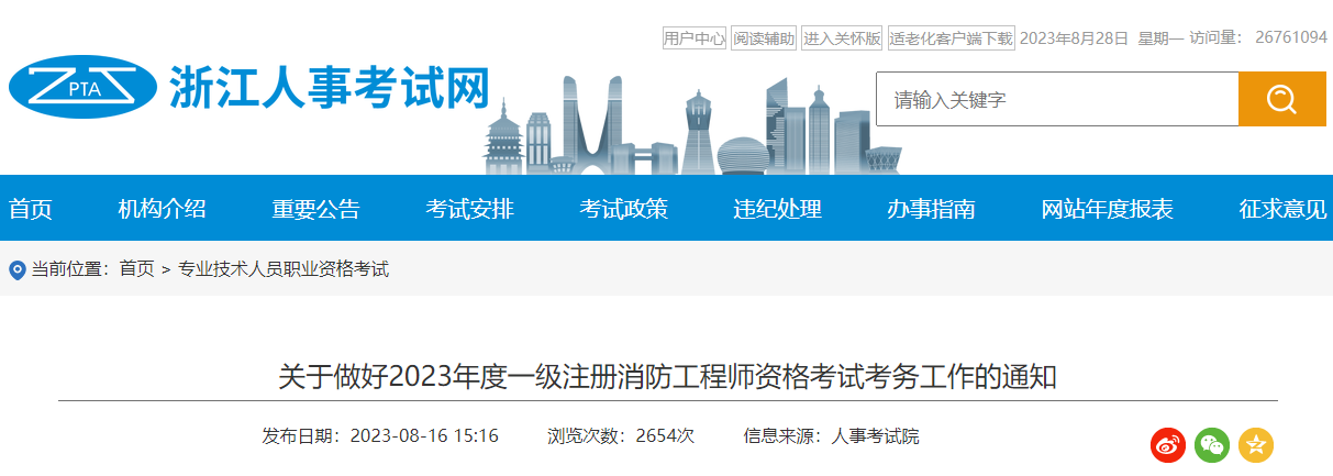 從浙江人事考試網(wǎng)發(fā)布的《2023年浙江一級注冊消防工程師職業(yè)資格考試考務(wù)工作通知》中得知,2023年浙江一級消防工程師考試時間定于11月4日-5日舉行,一級消防工程師考試實行全國統(tǒng)一大綱、統(tǒng)一命題、統(tǒng)一組織的辦法??荚嚲唧w時間、科目安排如下: