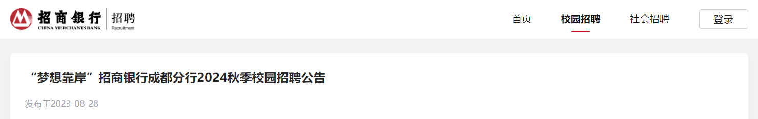 2024夢想靠岸招商銀行四川成都分行秋季校園招聘公告已發(fā)布,簡歷投遞時間:2023年10月6日截止,現(xiàn)將招聘公告發(fā)布如下: