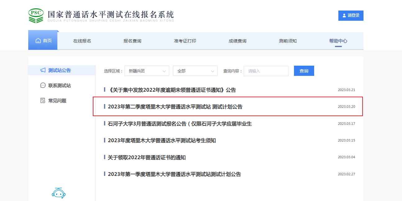 三、考生在國家普通話測試網(wǎng)→點(diǎn)擊測試報名→國家普通話水平測試在線報名系統(tǒng)→(新疆兵團(tuán))完成注冊;可在“幫助中心”頁面查看塔里木大學(xué)測試站公告及其它通知公告。