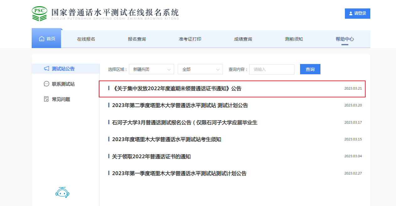 從國(guó)家普通話水平測(cè)試在線報(bào)名系統(tǒng)獲悉,新疆塔里木大學(xué)集中發(fā)放2022年度逾期未領(lǐng)普通話證書(shū)通知已公布,領(lǐng)取時(shí)間3月27日起,具體詳情如下: