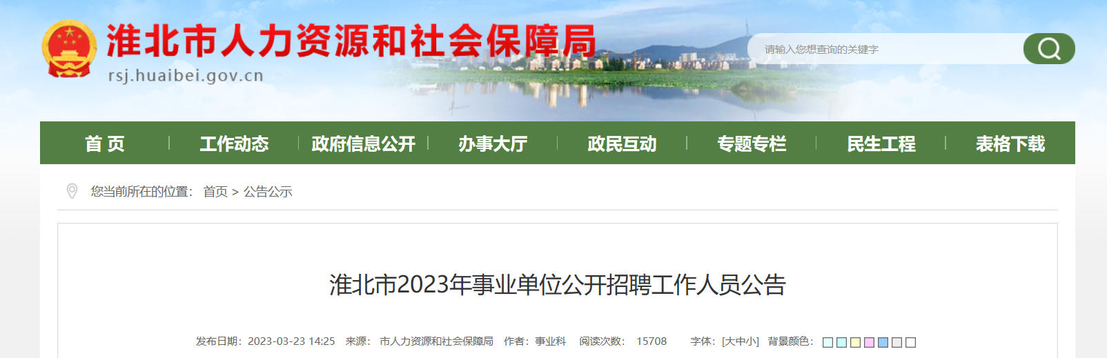 根據(jù)《事業(yè)單位人事管理?xiàng)l例》(國務(wù)院令第652號(hào))和中共安徽省委組織部、安徽省人力資源社會(huì)保障廳《關(guān)于印發(fā)〈安徽省事業(yè)單位公開招聘人員暫行辦法〉的通知》(皖人社發(fā)〔2010〕78號(hào))規(guī)定和要求,現(xiàn)就2023年度淮北市市事業(yè)單位公開招聘工作人員有關(guān)事項(xiàng)公告如下: