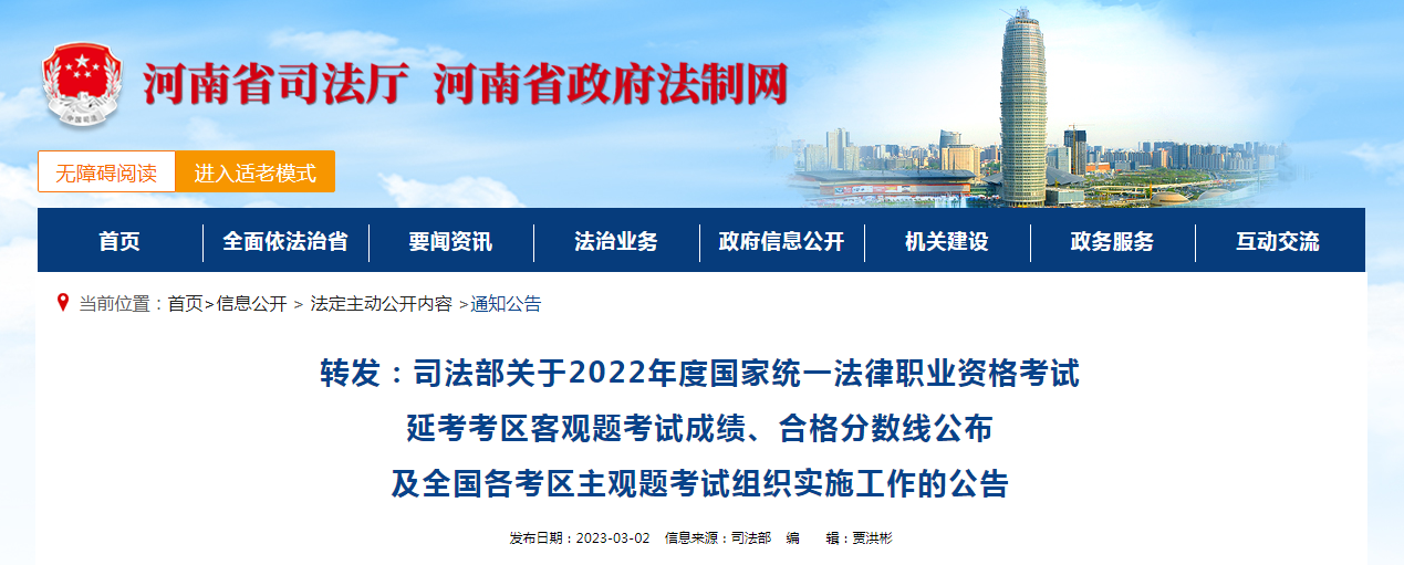 原文標題:轉發(fā):司法部關于2022年度國家統(tǒng)一法律職業(yè)資格考試延考考區(qū)客觀題考試成績、合格分數(shù)線公布及全國各考區(qū)主觀題考試組織實施工作的公告