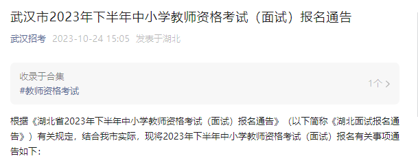 根據(jù)《湖北省2023年下半年中小學(xué)教師資格考試(面試)報名通告》(以下簡稱《湖北面試報名通告》)有關(guān)規(guī)定,結(jié)合我市實(shí)際,現(xiàn)將2023年下半年中小學(xué)教師資格考試(面試)報名有關(guān)事項(xiàng)通告如下: