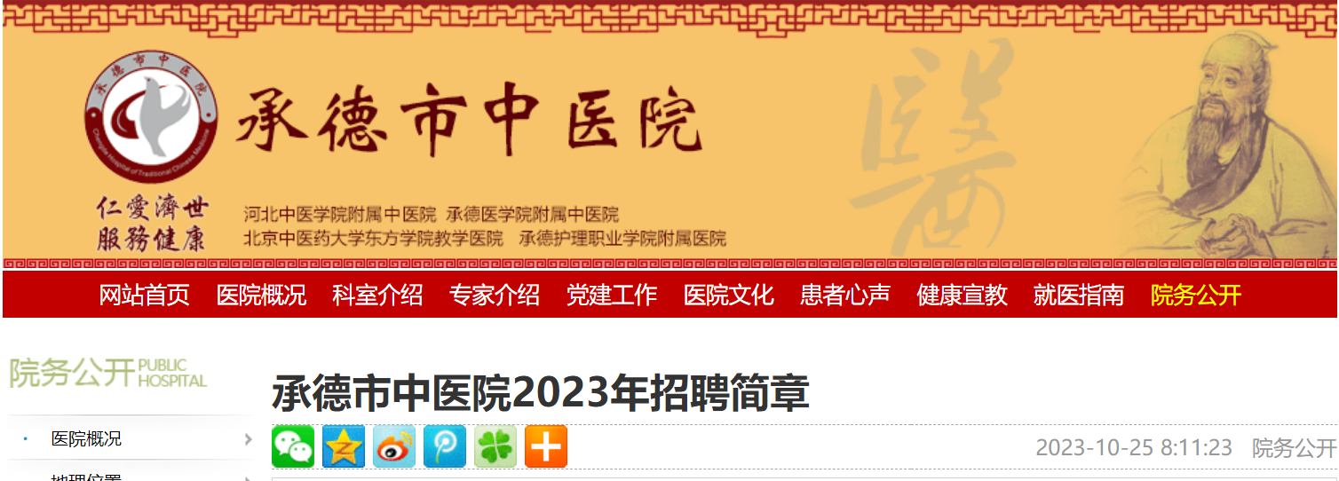 2023河北承德市中醫(yī)院招聘衛(wèi)生專業(yè)技術(shù)人才22名,報(bào)名時(shí)間:2023年10月25日至2023年11月3日。現(xiàn)將招聘公告原文發(fā)布如下: