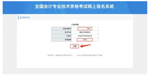 (3)考生核對訂單詳情中的“報名注冊號”、“交易金額”后,點擊“交費”按鈕,進行交費;