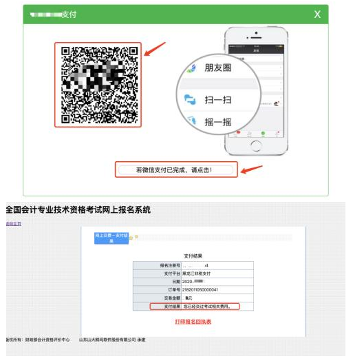 (5)考生使用手機打開“微信”或“支付寶”,掃描屏幕中的支付“二維碼”進行支付,支付成功后,點擊“支付完成”按鈕,系統(tǒng)跳轉至交費成功頁面;