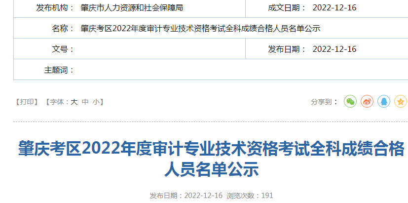 小編根據(jù)肇慶市人力資源和社會(huì)保障局發(fā)布“肇慶考區(qū)2022年度審計(jì)專業(yè)技術(shù)資格考試全科成績(jī)合格人員名單公示”得知,2022年廣東肇慶審計(jì)師考試全科成績(jī)合格人員公示時(shí)間為2022年12月16日至2022年12月29日,詳情如下: