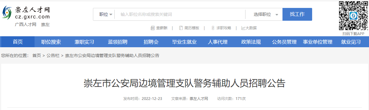#】從崇左人才網(wǎng)了解到,2022年廣西崇左市公安局邊境管理支隊(duì)警務(wù)輔助人員招聘180人,報(bào)名時(shí)間:12月19日-1月31日,相關(guān)事宜如下: