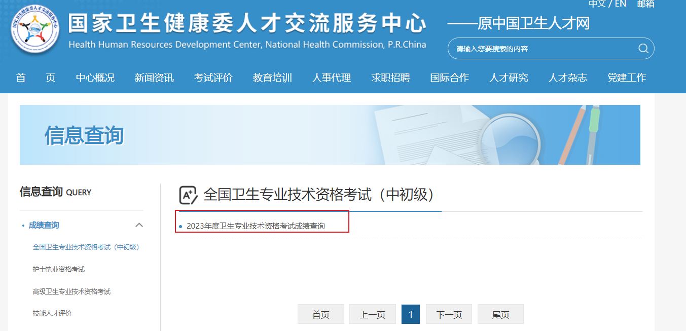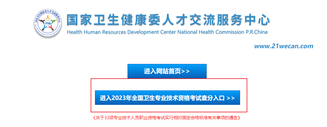 1、登錄國(guó)家衛(wèi)生健康委人才交流服務(wù)中心網(wǎng)站,點(diǎn)擊進(jìn)入2023年全國(guó)衛(wèi)生專業(yè)技術(shù)資格考試查分入口。