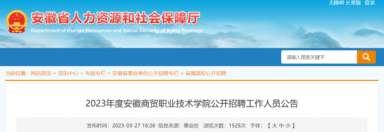 為做好2023年度安徽商貿(mào)職業(yè)技術(shù)學(xué)院面向社會公開招聘工作人員工作,根據(jù)《事業(yè)單位人事管理條例》(國務(wù)院令第652號)和中共安徽省委組織部、安徽省人力資源和社會保障廳《關(guān)于印發(fā)<安徽省事業(yè)單位公開招聘人員暫行辦法〉的通知》(皖人社發(fā)〔2010〕78號)規(guī)定,現(xiàn)就有關(guān)事項公告如下: