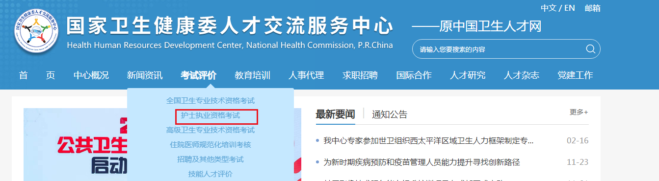 1.登錄國(guó)家衛(wèi)生健康委人才交流中心網(wǎng)站(www.21wecan.com),在“考試評(píng)價(jià)”欄目?jī)?nèi)選擇-護(hù)士執(zhí)業(yè)資格考試。