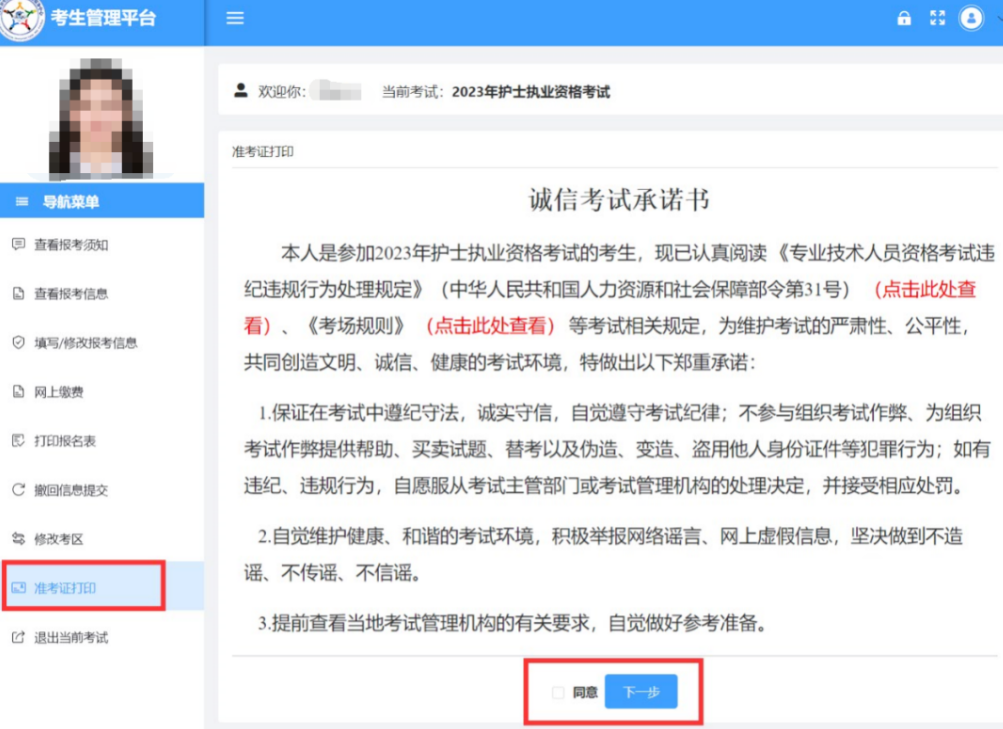 認(rèn)真閱讀《誠(chéng)信考試承諾書》(下圖以護(hù)士執(zhí)業(yè)資格考試為例),勾選“同意”。