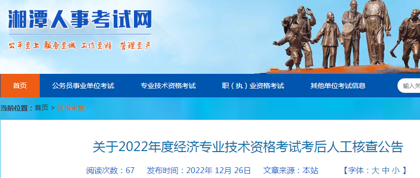 根據(jù)人力資源和社會(huì)保障部人事考試中心《關(guān)于印發(fā)〈專業(yè)技術(shù)人員職業(yè)資格考試報(bào)名證明事項(xiàng)告知承諾制工作規(guī)程〉的通知》(人考中心函〔2021〕1號(hào))、省人力資源社會(huì)保障廳《關(guān)于專業(yè)技術(shù)人員資格考試實(shí)行考后資格審查的通知》(湘人社函〔2012〕526號(hào))、《關(guān)于做好2022年度經(jīng)濟(jì)專業(yè)技術(shù)資格考試考務(wù)工作的通知》(人考中心函〔2022〕11號(hào))精神,現(xiàn)將做好2022年度經(jīng)濟(jì)專業(yè)技術(shù)資格考試考后人工核查工作有關(guān)事項(xiàng)公告如下: