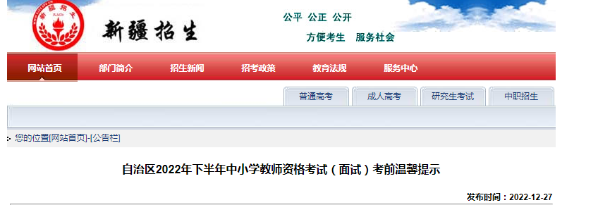 從新疆招生網(wǎng)獲悉,2022下半年新疆中小學(xué)教師資格考試面試考前溫馨提示已公布,面試時(shí)間2023年1月7日-8日,具體詳情如下: