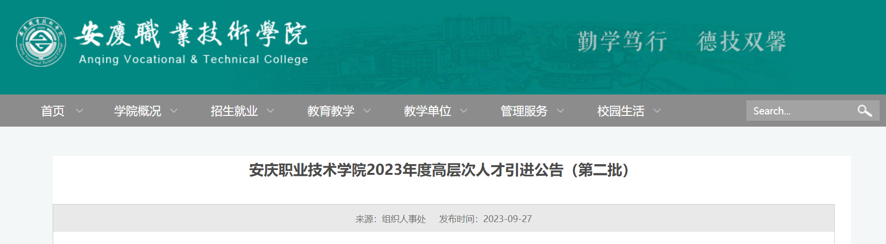 2023年度安徽安慶職業(yè)技術(shù)學(xué)院第二批高層次人才引進(jìn)3人,報名時間為2023年9月27日至2023年12月22日,或崗位招滿為止?,F(xiàn)將招聘公告原文發(fā)布如下:
