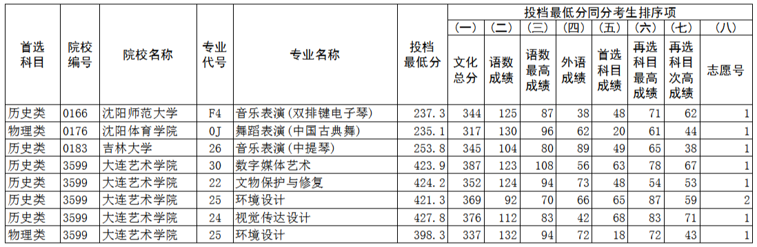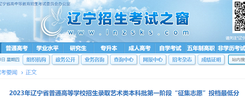高考頻道從遼寧招生考試之窗了解到,2023年遼寧普通高等學校招生錄取藝術類本科批第一階段“征集志愿”投檔最低分已公布,具體如下: