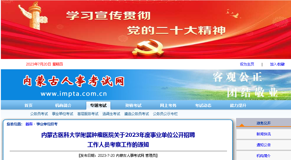 根據(jù)《內(nèi)蒙古醫(yī)科大學(xué)2023年度事業(yè)單位公開招聘工作人員公告》,醫(yī)院定于2023年7月24日組織開展考察工作,現(xiàn)將有關(guān)事宜通知如下: