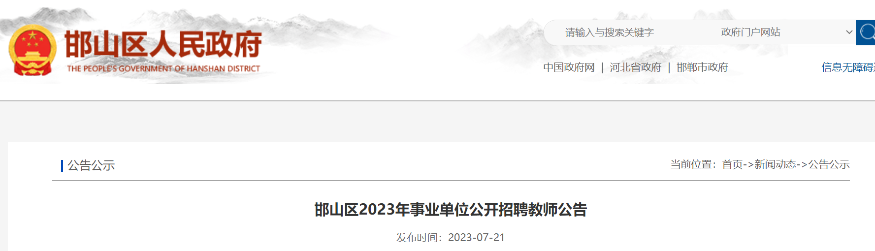 根據(jù)事業(yè)單位公開招聘有關(guān)規(guī)定和《邯鄲市人力資源和社會保障局關(guān)于下達2023年度政府系統(tǒng)事業(yè)單位公開招聘計劃的通知》,經(jīng)邯山區(qū)委區(qū)、政府研究決定面向社會公開招聘教師70名,現(xiàn)將有關(guān)事項公告如下: