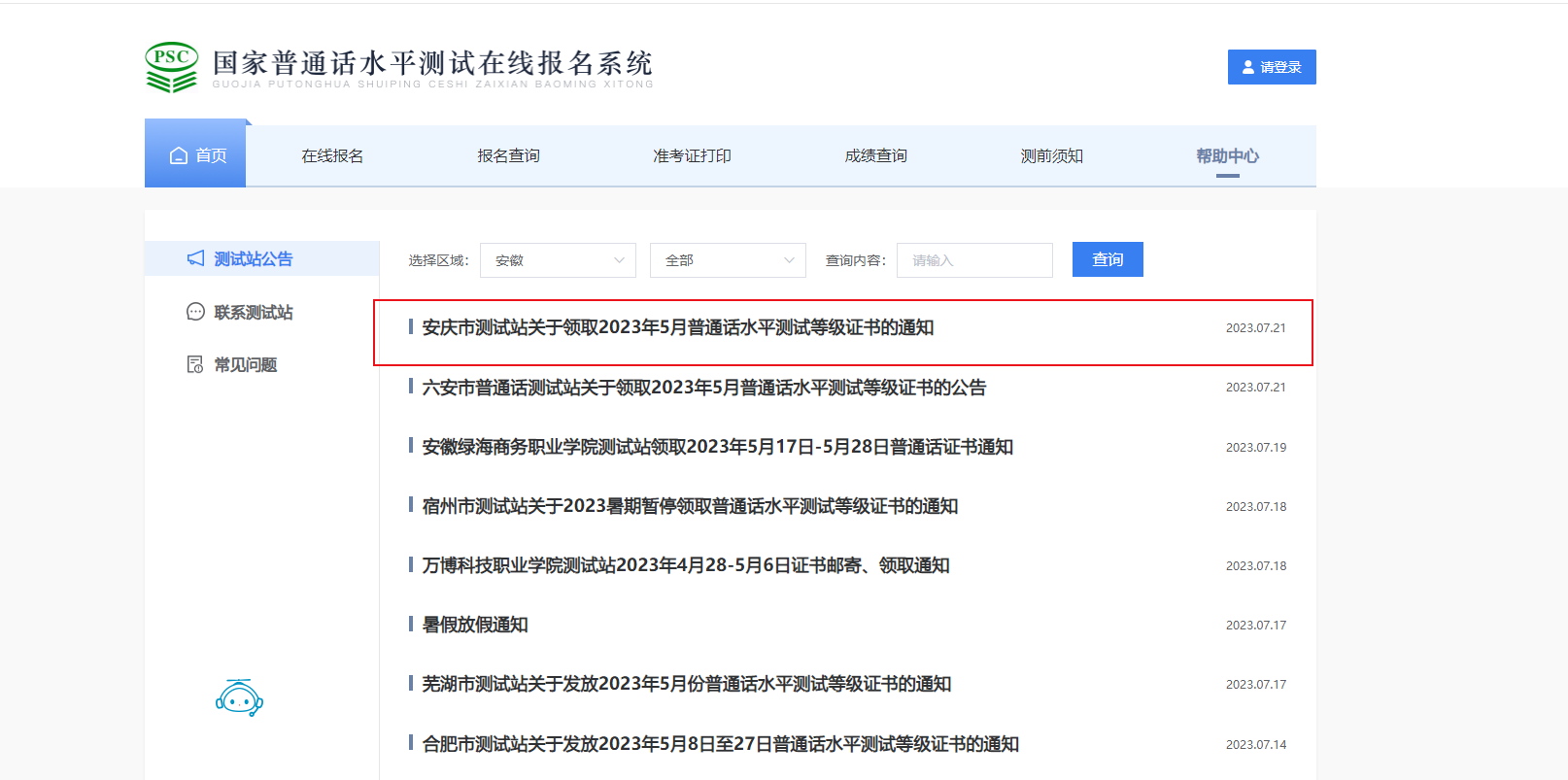 1.不在我站(安慶市測(cè)試站)參加測(cè)試的考生,其證書(shū)不由我站發(fā)放,請(qǐng)登錄“報(bào)名系統(tǒng)”(https://bm.cltt.org/)-“幫助中心”-“測(cè)試站公告”頁(yè)面查詢對(duì)應(yīng)測(cè)試站的發(fā)證通知。