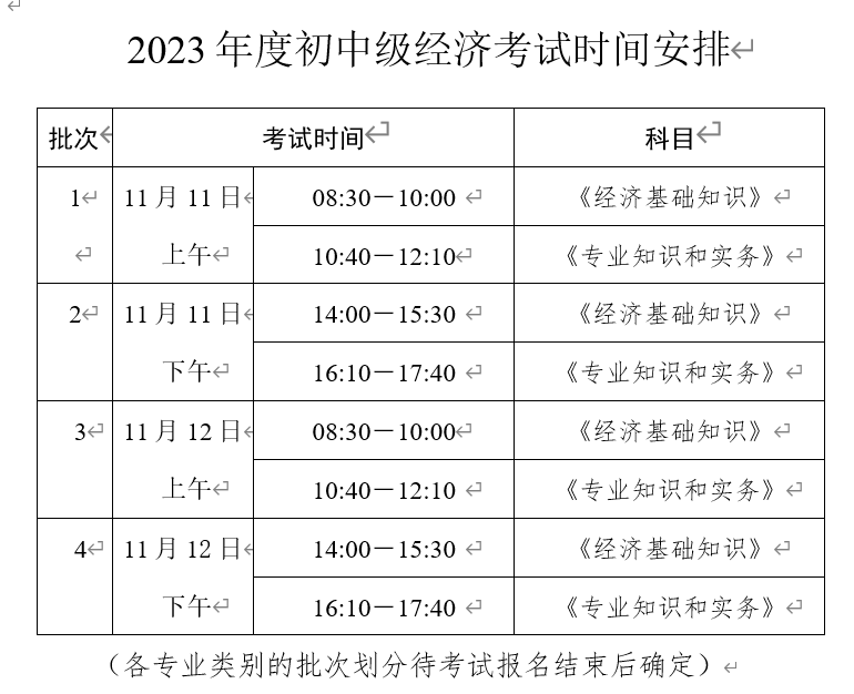 初中級經(jīng)濟考試分2天,上、下午共4個批次實施(見附件)。各級別及專業(yè)類別的具體批次劃分和考試時間,視報名情況另行確定。