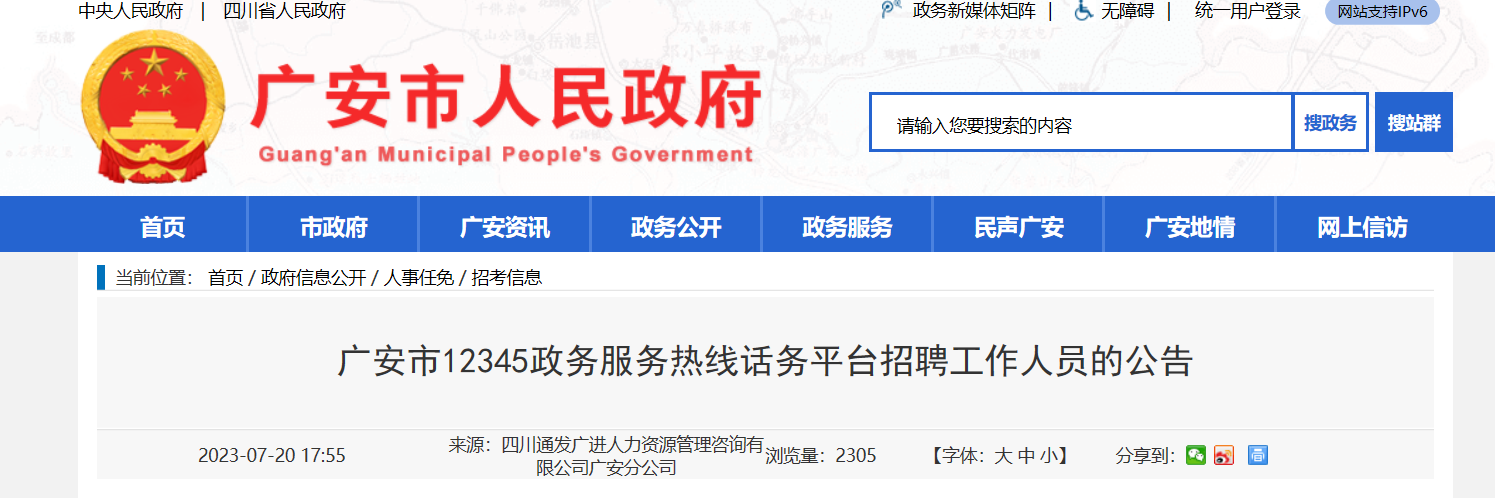 2023年四川省廣安市12345政務(wù)服務(wù)熱線話務(wù)平臺招聘工作人員。報名時間:長期有效?,F(xiàn)將公告原文發(fā)布如下: