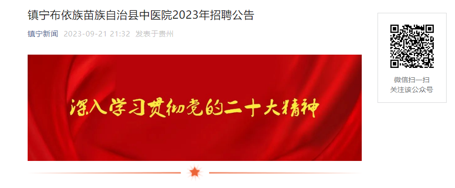 2023貴州安順鎮(zhèn)寧布依族苗族自治縣中醫(yī)院招聘16人,現(xiàn)場報名、網(wǎng)上報名,時間2023年09月22日至2023年9月28日,現(xiàn)將招聘公告原文發(fā)布如下: