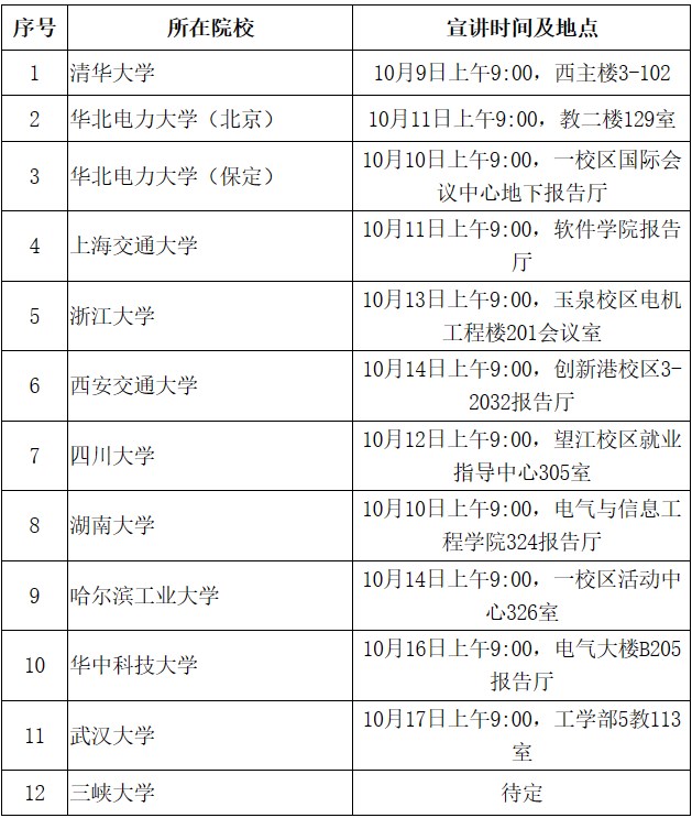 1.現(xiàn)場(chǎng)宣講院校:清華大學(xué)、華北電力大學(xué)(北京)、華北電力大學(xué)(保定)、上海交通大學(xué)、浙江大學(xué)、西安交通大學(xué)、四川大學(xué)、湖南大學(xué)、哈爾濱工業(yè)大學(xué)、華中科技大學(xué)、武漢大學(xué)、三峽大學(xué)。