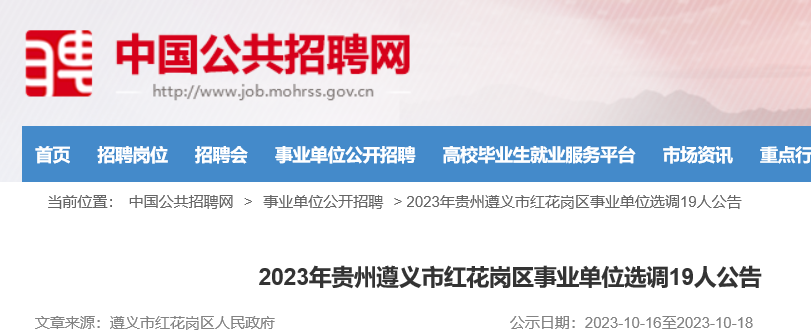 小編根據(jù)中國公共招聘網(wǎng)發(fā)布“2023年貴州遵義市紅花崗區(qū)事業(yè)單位選調(diào)19人公告”得知,2023年貴州遵義市紅花崗區(qū)事業(yè)單位選調(diào)報(bào)名時(shí)間為10月16日至18日,招聘19人。