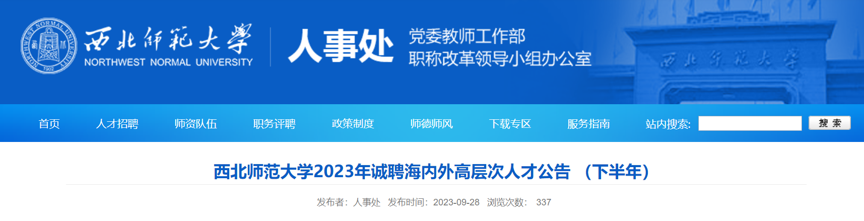 2023下半年甘肅西北師范大學(xué)誠聘海內(nèi)外高層次人才50名,報名時間:從本公告發(fā)布之日起至2023年11月30日截止?,F(xiàn)將招聘公告原文發(fā)布如下: