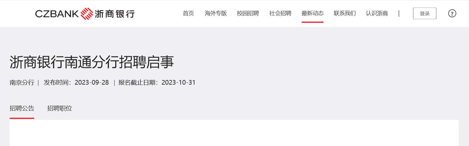 2023年浙商銀行江蘇南通分行招聘啟事已發(fā)布,簡(jiǎn)歷接收時(shí)間:2023年10月31日截止,現(xiàn)將招聘公告發(fā)布如下: