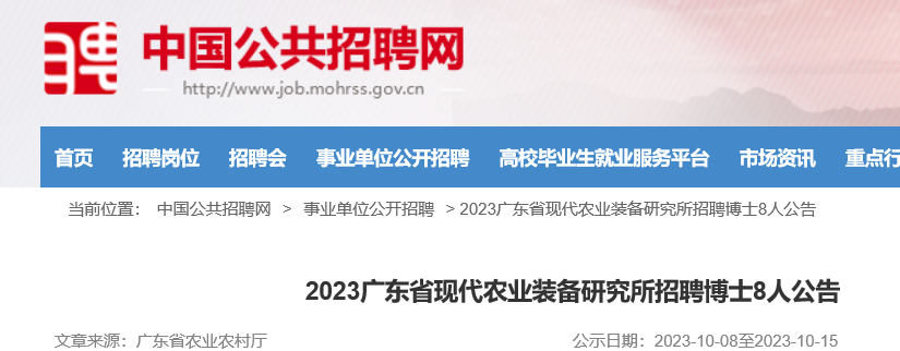 小編根據(jù)廣東省現(xiàn)代農(nóng)業(yè)裝備研究所發(fā)布“2023廣東省現(xiàn)代農(nóng)業(yè)裝備研究所招聘博士8人公告”得知,2023廣東省現(xiàn)代農(nóng)業(yè)裝備研究所招聘博士8人,報(bào)名時(shí)間為10月8日-10月15日,詳情如下: