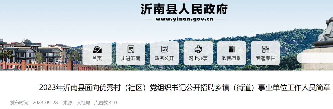 小編根據(jù)沂南縣人力資源和社會(huì)保障局發(fā)布“2023年沂南縣面向優(yōu)秀村(社區(qū))黨組織書記公開招聘鄉(xiāng)鎮(zhèn)(街道)事業(yè)單位工作人員簡(jiǎn)章”得知,2023山東臨沂沂南縣面向優(yōu)秀村(社區(qū))黨組織書記招聘鄉(xiāng)鎮(zhèn)(街道)事業(yè)單位工作人員1人,10月8日下午5:00前報(bào)鄉(xiāng)鎮(zhèn)(街道)黨(工)委。