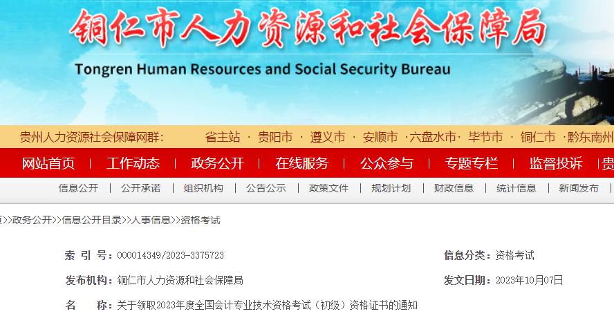 小編根據(jù)銅仁市人力資源和社會(huì)保障局發(fā)布“關(guān)于領(lǐng)取2023年度全國(guó)會(huì)計(jì)專業(yè)技術(shù)資格考試(初級(jí))資格證書的通知”得知,2023年貴州銅仁初級(jí)會(huì)計(jì)職稱考試資格證書領(lǐng)取時(shí)間為2023年10月7日至2024年4月30日,