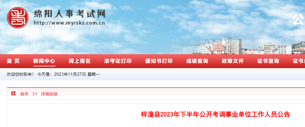 小編根據(jù)綿陽人事考試網(wǎng)發(fā)布“梓潼縣2023年下半年公開考調(diào)事業(yè)單位工作人員公告”得知,2023下半年四川綿陽市梓潼縣考調(diào)事業(yè)單位人員8人,報名時間11月27日-12月1日。