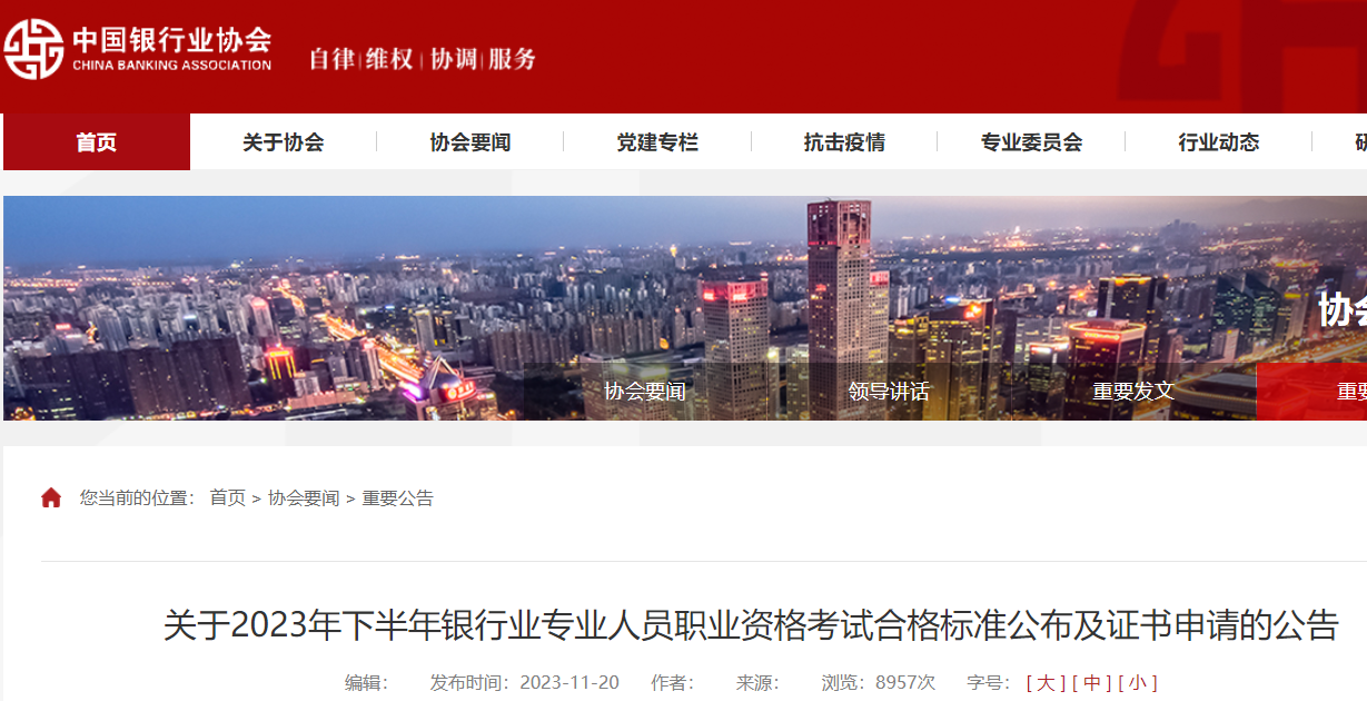 小編根據(jù)中國(guó)銀行業(yè)協(xié)會(huì)發(fā)布“關(guān)于2023年下半年銀行業(yè)專(zhuān)業(yè)人員職業(yè)資格考試合格標(biāo)準(zhǔn)公布及證書(shū)申請(qǐng)的公告”得知,2023年下半年銀行業(yè)專(zhuān)業(yè)人員職業(yè)資格考試初級(jí)和中級(jí)各科目全國(guó)合格標(biāo)準(zhǔn)均為60分,證書(shū)申請(qǐng)時(shí)間為2023年11月21日至12月1日。