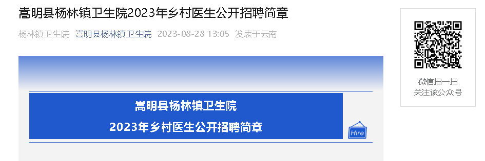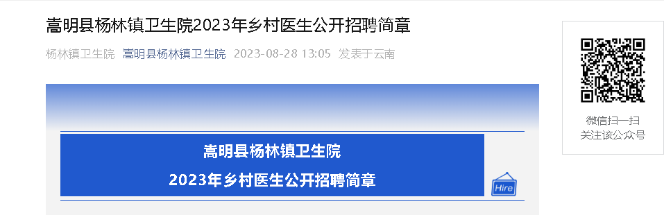 2023云南昆明市嵩明縣楊林鎮(zhèn)衛(wèi)生院鄉(xiāng)村醫(yī)生招聘6人,報名時間:2023年8月29日-9月5日(周一至周五,周末休息)8:30--16:00,現(xiàn)將招聘公告原文發(fā)布如下: